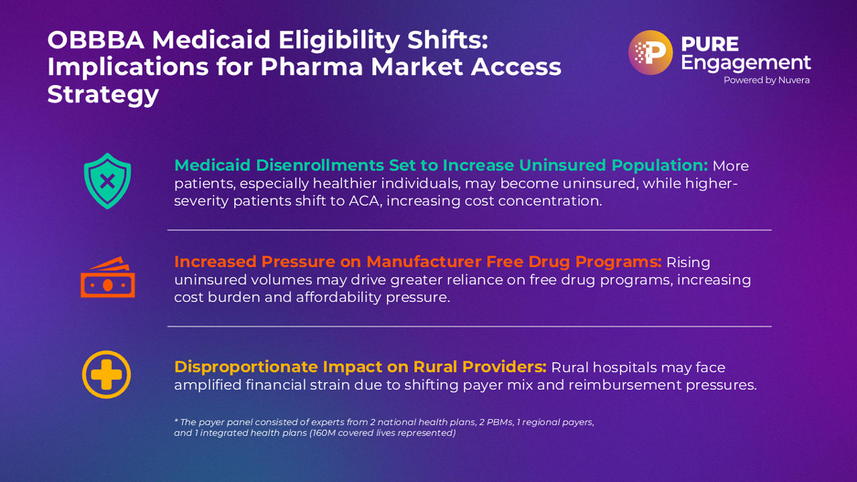 Taken together, OBBBA-driven Medicaid shifts reinforce a broader trend toward more fluid and interconnected access conditions. As coverage transitions continue to unfold (e.g., Medicaid to commercial or uninsured), a greater share of patients are expected to become uninsured or underinsured, with payers anticipating that manufacturers will absorb a larger share of the financial burden through expanded copay assistance utilization, increased reliance on patient assistance programs (PAP), and heightened exposure to 340B pricing as safety-net providers manage growing volumes of uninsured and underinsured patients.